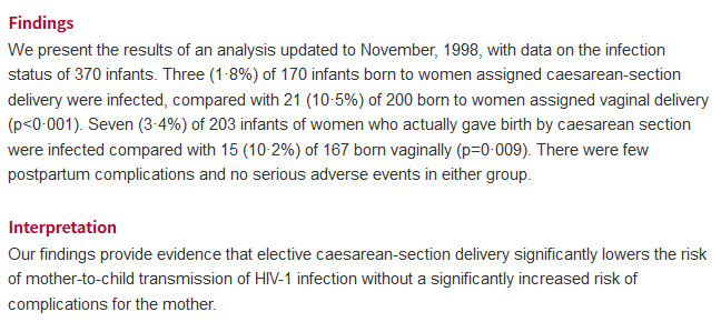 (1) Elective caesarean-section versus vaginal delivery in prevention of vertical HIV-1 transmission: a randomised clinical trial - Tài liệu này được lựa chọn vì đây là một nghiên cứu RCT (Randomised Clinical Trial - Thử nghiệm lâm sàng có đối chứng ngẫu nhiên) được đăng tải trên The Lancet. Đây là loại nghiên cứu có mức độ bằng chứng cao. Kết quả của nghiên cứu này như sau: