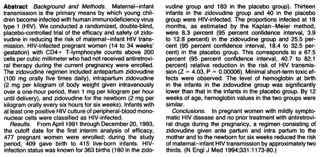 (4) Reduction of Maternal-Infant Transmission of Human Immunodeficiency Virus Type 1 with Zidovudine Treatment - Tiếp tục là một nghiên cứu RCT được đăng trên tạp chí NEJM chứng minh cho lợi ích của việc sử dụng thuốc kháng virus trước, trong và sau sinh cho phụ nữ có thai nhiễm HIV: